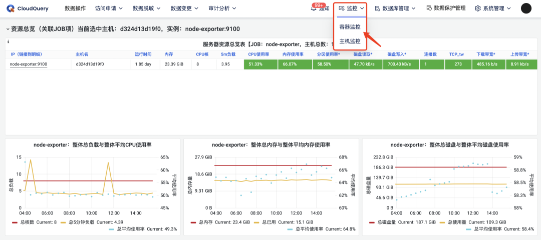 V 2.4.0 支持了容器监控和主机监控,能够实时监控系统的 CPU 内存、网络 I/O、磁盘 I/O ...... 使用情况。