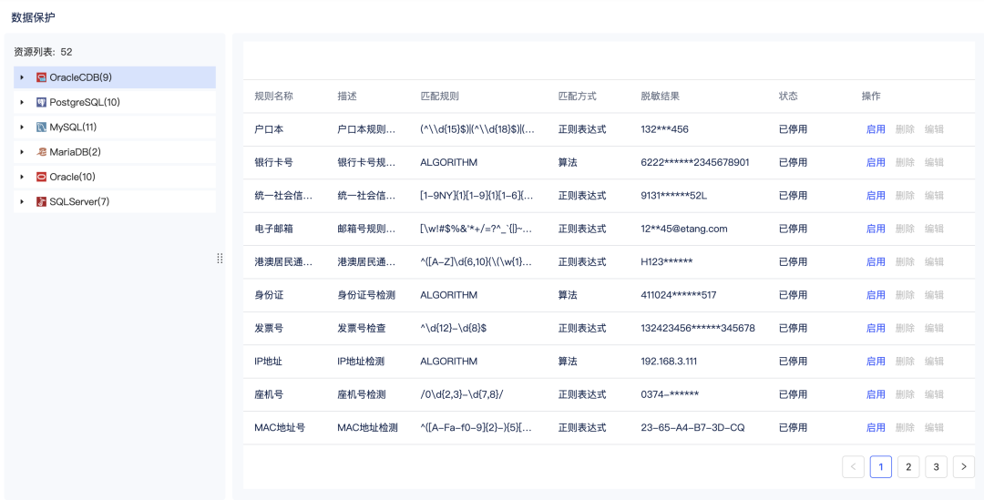 本次更新增加了系统内置脱敏规则,包含身份证号、银行卡号、发票号、IP地址等10种常用规则。可根据选定的脱敏规则在结果集展示中实现动态脱敏。