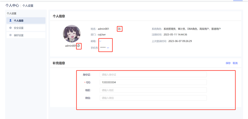 个人模块新增个人具体信息展示,包括头像、系统角色、账号注册时间、上次登录时间等信息