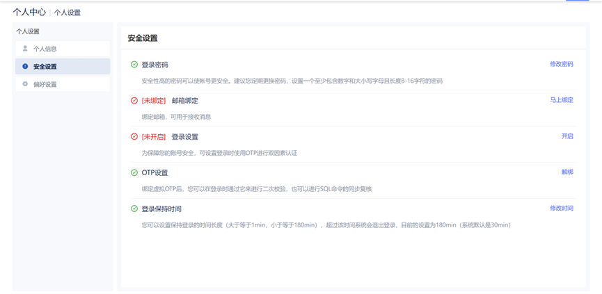 个人模块新增安全设置,包括邮箱绑定、OTP 绑定、登录设置、登录保持时间设置