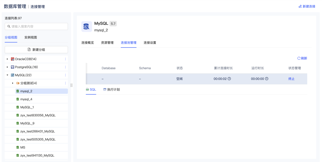 连接管理模块新增连接池管理,可管理连接池的使用情况,查看连接的执行 SQL、执行计划等