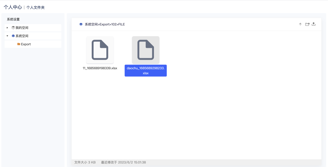 个人文件夹新增系统文件,用于保存系统中导出的文件,DBA 角色可查看系统中所有的导出文件,其他用户只能看到自己导出的文件,选中单个文件双击即可下载。